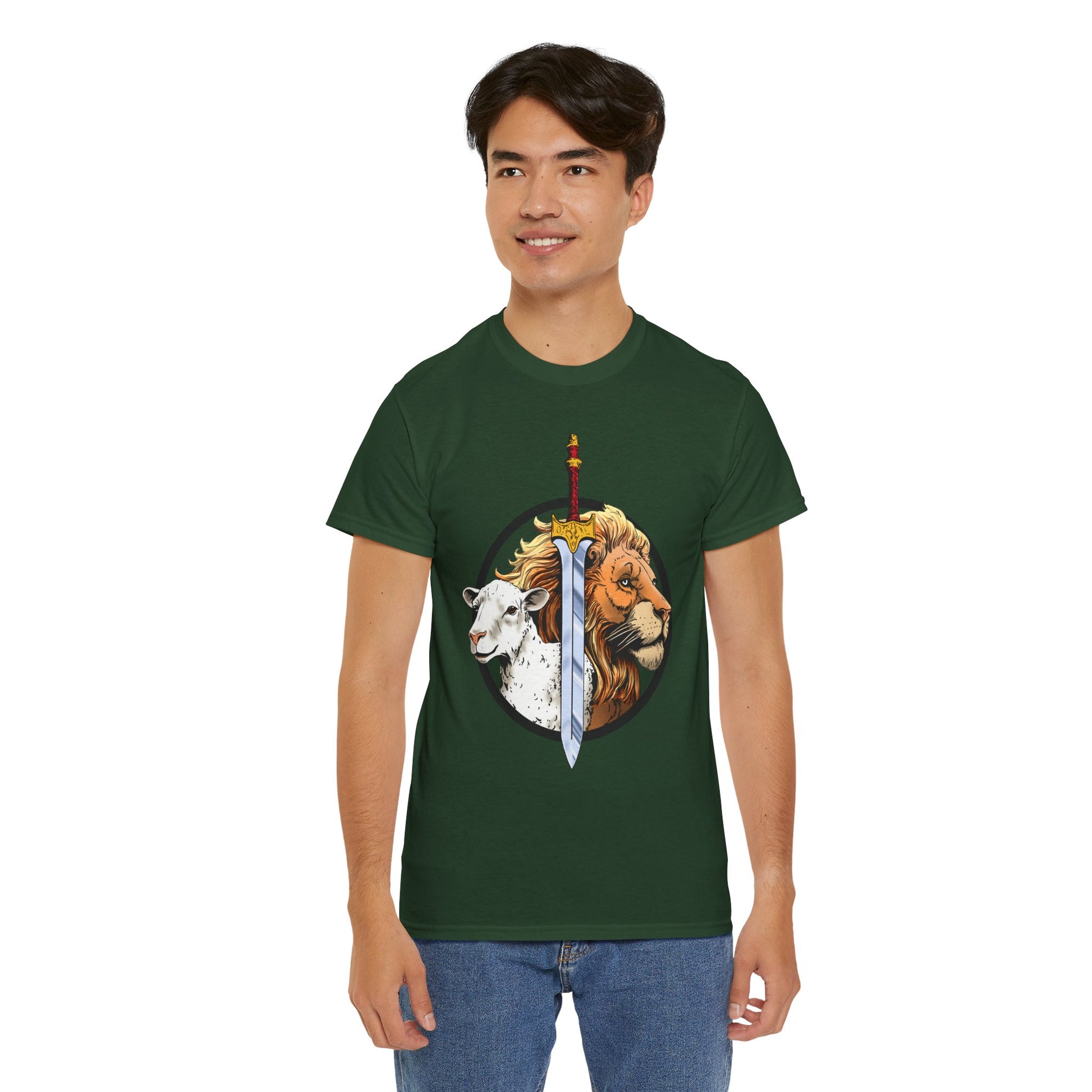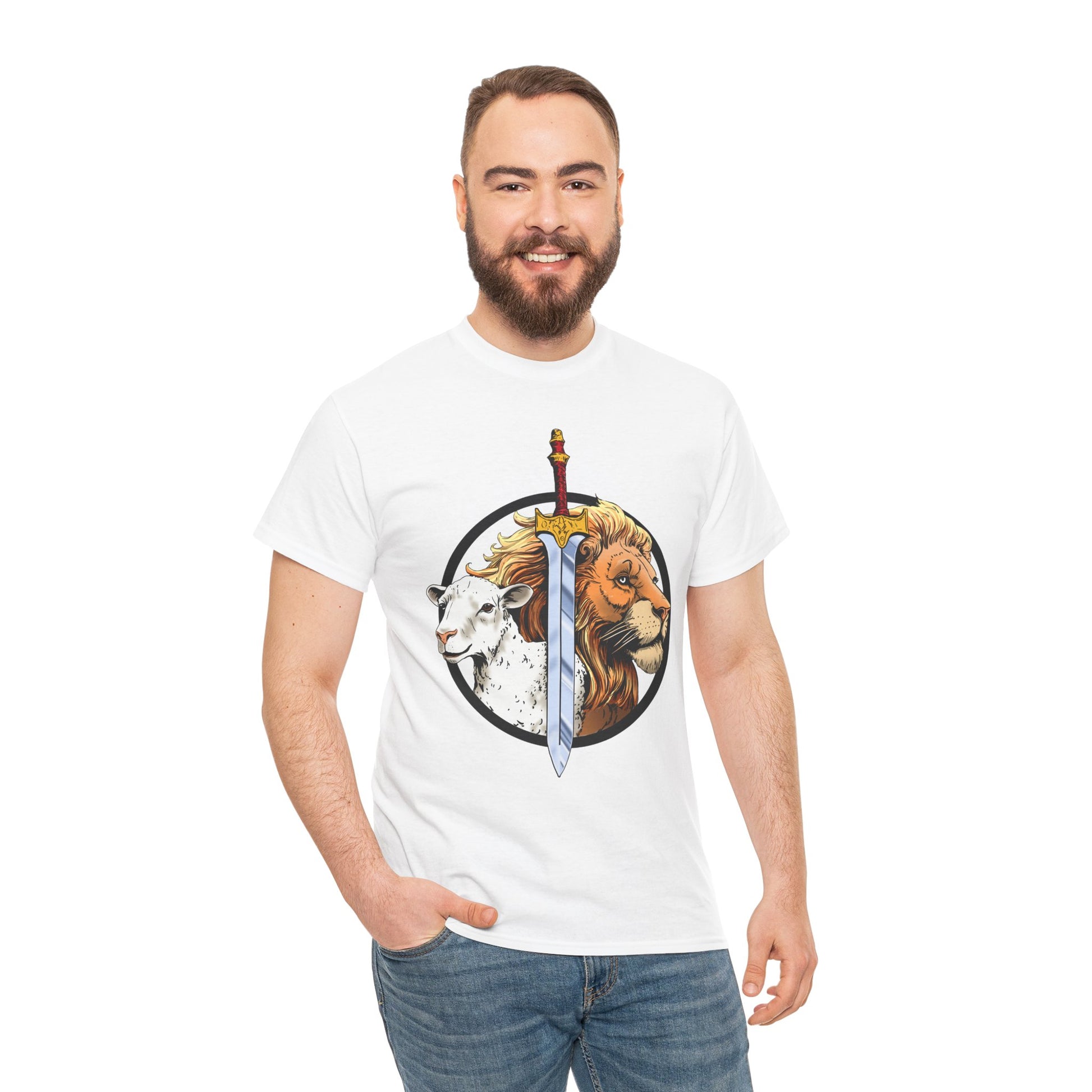 Faith meets bold design in the Lion & Lamb Sword Tee. Featuring the powerful imagery of the Lion of Judah and the Lamb of God divided by a gleaming sword, this shirt represents strength, sacrifice, and victory. The artwork captures the balance of power and humility, courage and grace—making it more than just a shirt, but a statement of belief.